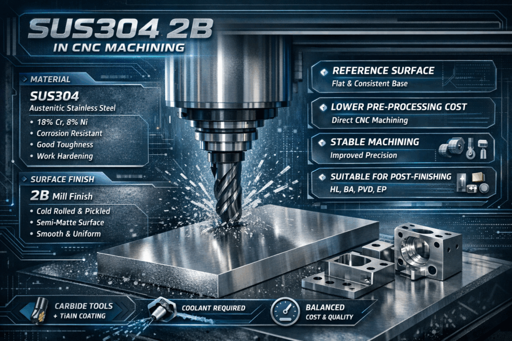 SUS304 2B 是 CNC 精密加工中最具性價比的標準不鏽鋼材料狀態,兼具加工穩定性、表面一致性與後處理適應性,廣泛應用於高精度工業與半導體設備零組件。